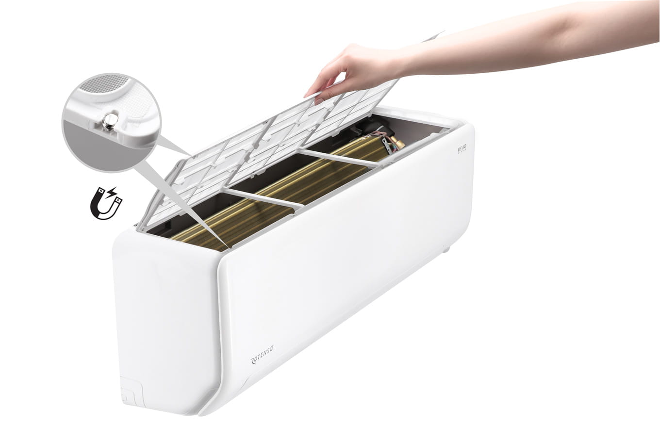 Revio to także niespotykana dotąd prostota montażu jednostki wewnętrznej, która posiada tylko jedną śrubę i 2 zatrzaski, dzięki czemu demontaż jednostki nie powinien zająć więcej niż minutę. Zaletą jest także łatwy dostęp do filtrów klimatyzatora, które użytkownik może samodzielnie czyścić, w szybki i łatwy sposób poprzez uwolnienie magnesów górnej pokrywy klimatyzatora i wyjęcie od góry oraz ponowne włożenie oczyszczonych filtrów.