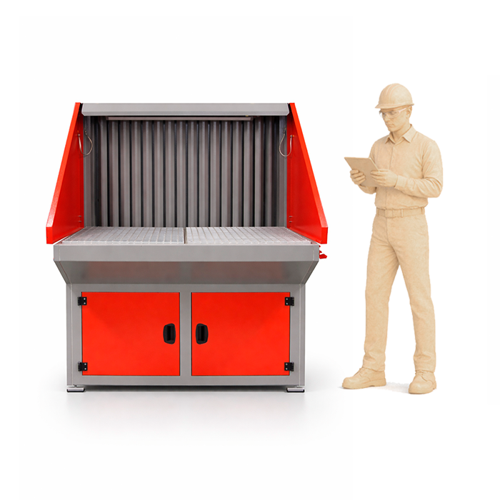 Konstrukcja stołu umożliwia wstępne osadzanie większych cząstek oraz iskier, co chroni filtry i wydłuża ich żywotność. Zgromadzone zanieczyszczenia trafiają do wysuwnego pojemnika przeznaczonego do ich usuwania.